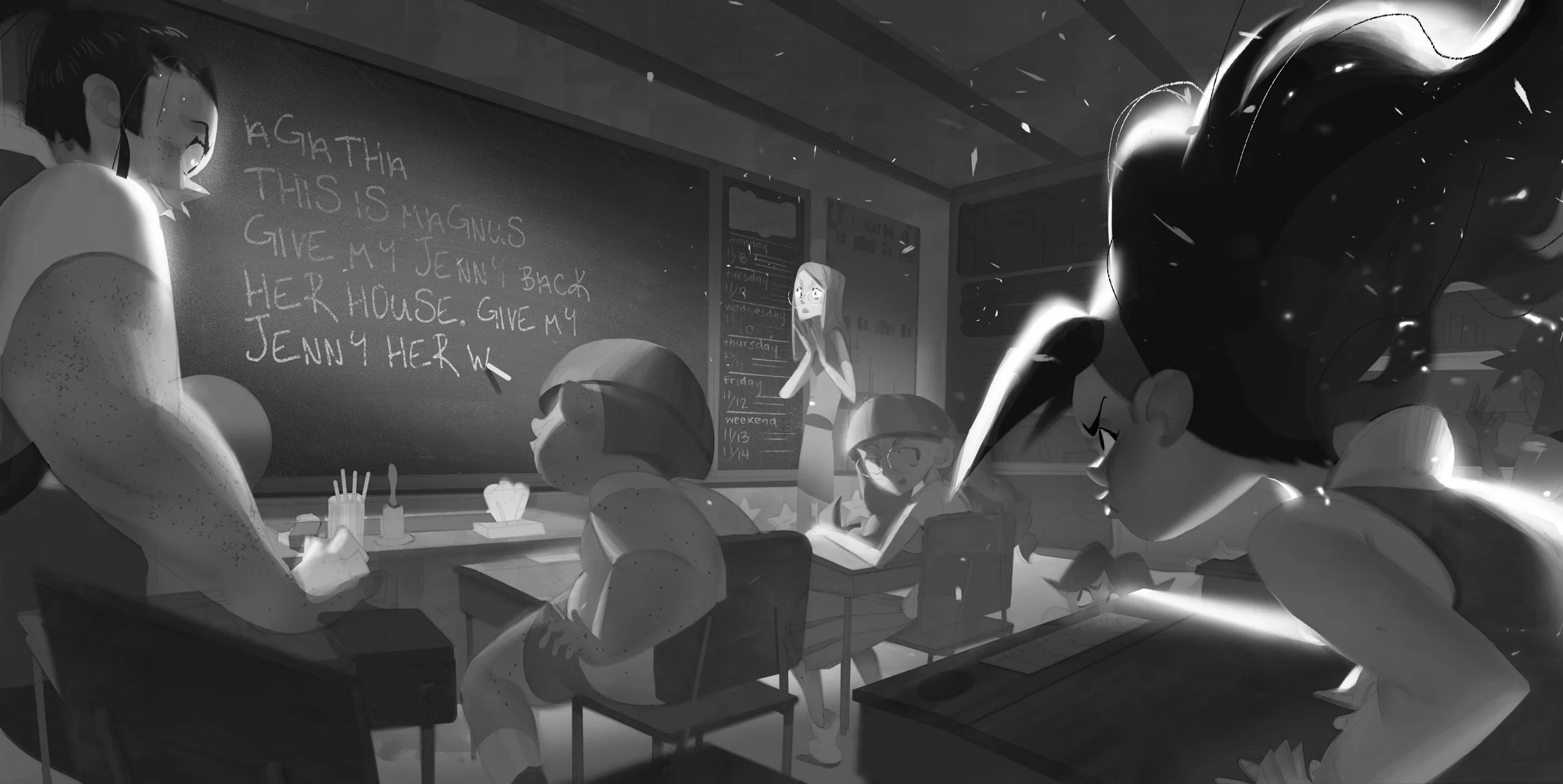 Based on a children's book by Roald Dahl, this visual development project illustrates the story of Matilda Wormwood - a young prodigy with psychokinetic powers unappreciated by her horrible parents. She befriends her school teacher, Miss Honey, who inspires Matilda to master her powers and get even with the evil headmistress, Miss Trunchbull.